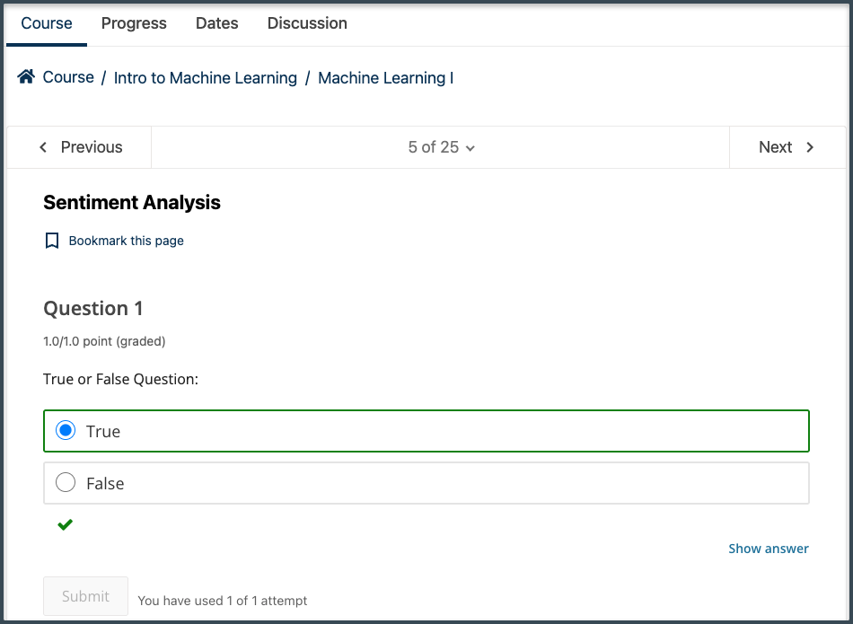 Important Note: There are certain situations in which it is not possible to make the Green Checkmark appear for a piece of Course Content. For example, if you join a course session after the due date has passed for a piece of Coursework, you will never be able to submit that Coursework—and consequently, the Green Checkmark can never appear for either the Coursework Problem itself, or the Courseware Page and Section it resides within. |