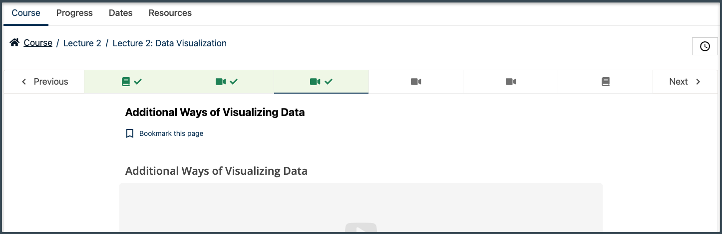 The MIT Learn / MITx Online Learning Platform is designed to display Green Checkmarks within the Courseware to serve as an indicator of which parts of the Course Content you have already seen and completed, and help you locate content you may have missed.