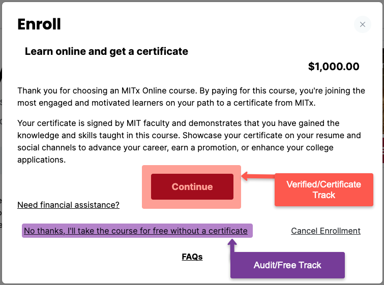 - Audit Track: If you do not plan to take the Proctored Exam or earn the Course Certificate, of if you want to try the course out paying, or you simply want to wait to submit payment, click "No thanks, I'll take the free version without a certificate"